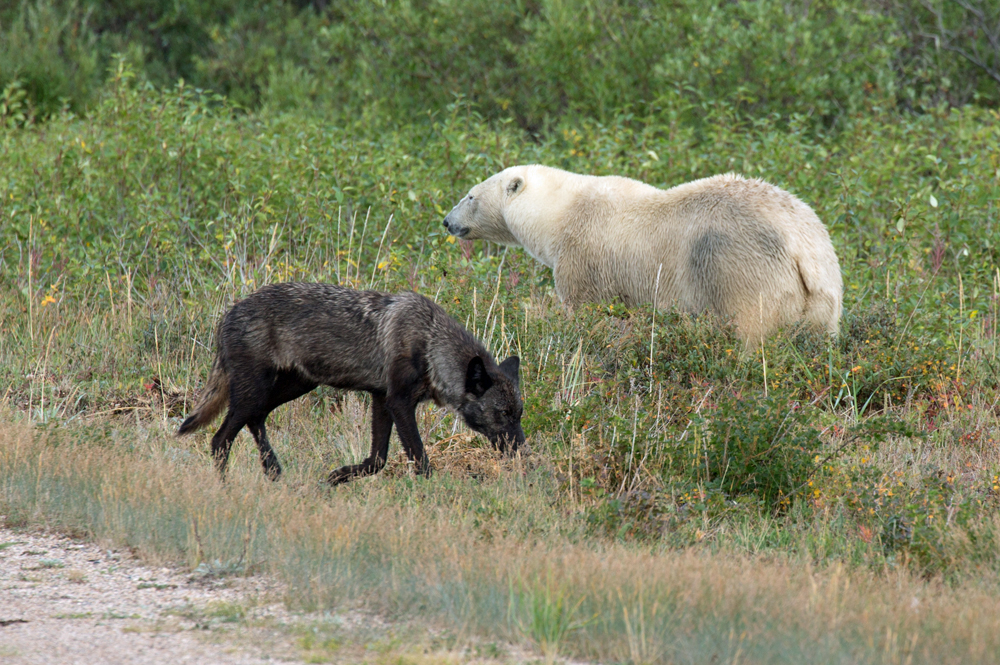 - Wolf and polar bear meet at Nanuk Polar Bear Lodge. George Kourounis.